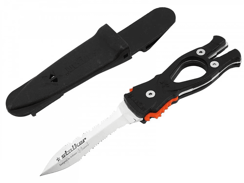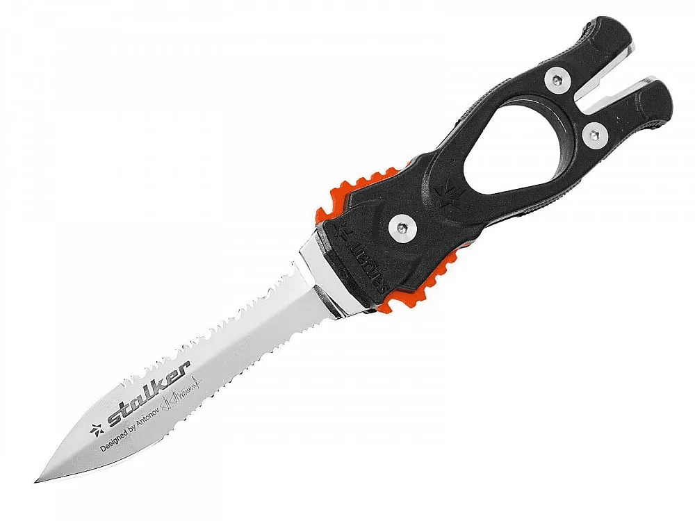 Удлиненная вогнутая линия реза, существенно облегчает разрезание одним движением различного рода шнуров, лесок, сетей — смертельную опасность для подводного охотника. Копьевидное острие клинка имеет хорошую проникающую способность, что позволяет уверенно обездвиживать даже самую крупную трофейную рыбу. Рукоятка ножа имеет отверстие под палец, чтобы не выпускать нож из рук и «»уключину»» для вытаскивания застрявших гарпунов. Фиксация клинка в ножнах — развитие идеи двойной защелки «»типа фастекс»». Выполнено из ударопрочного и морозоустойчивого полимера. Самый надежный на данный момент из всех существующих видов фиксаторов. Открывается только рукой, исключая случайное срабатывание и утерю ножа. Специальный Нож Подводного Охотника «»Сталкер Стропорез ZR1″», рекомендуется размещать на левой стороне груди, (на штатных клипсах костюмов SARGAN), что гарантирует быстрое и легкое извлечение ножа из ножен, любой рукой, из любого положение, одним движением и обеспечивает мгновенную готовность к применению. Специальный Нож Подводного Охотника «Сталкер Стропорез ZR1», размещенный на левой стороне груди, (на штатных клипсах костюмов «Сарган») гарантирует быстрое и легкое извлечение ножа из ножен: любой рукой, из любого положения, одним движением и обеспечивает мгновенную готовность к применению. Подготовленный охотник вынимает нож Сталкер Стропорез ZR1 за 0,4 сек.