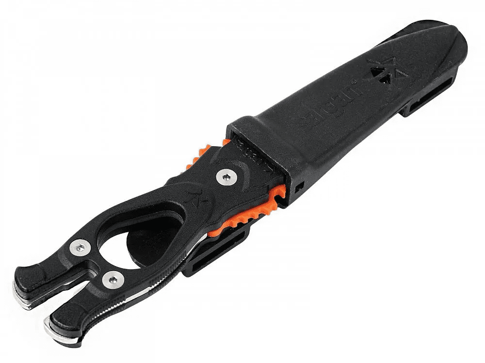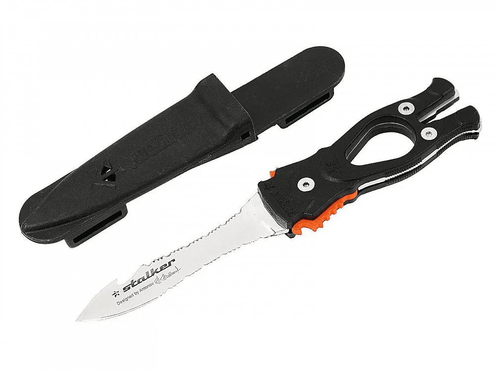 Специальный нож Подводного Охотника — «»Сталкер-Стропорез ZR2″», имеет мощный прочный клинок с характерной формой стропореза. Удлиненная вогнутая линия реза, существенно облегчает разрезание одним движением различного рода шнуров, лесок, сетей — смертельную опасность для подводного охотника. Копьевидное острие клинка имеет хорошую проникающую способность, что позволяет уверенно обездвиживать даже самую крупную трофейную рыбу. Нержавеющая сталь 50Cr14mov Рукоятка ножа имеет отверстие под палец, чтобы не выпускать нож из рук и «»уключину»» для вытаскивания застрявших гарпунов.