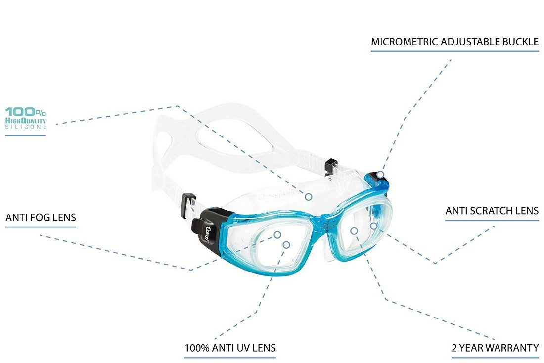 Плоские линзы установлены на жесткой рамке, как у маски для ныряния, что гарантирует идеальное зрение без искажений. Форма линзы совершенно плоская и не имеют побочных изгибов, а также предотвращает раздражающих искажений по бокам линз. Водонепроницаемое уплотнение безупречно и комфортно. Ремешок имеет систему быстрой регулировки (запатентованная Cressi), аналогичный тому, который используется на популярных Cressi-Sub маски, позволяет быстро и легко регулировать длину. Небьющиеся линзы имеют защиту против внешнего воздействия, царапин, защита от ультрафиолетовых лучей, нанесено покрытие против запотевания. Чтобы очки для плавания не запотевали во время тренировки, линзы с внутренней стороны покрываются антизапотевающим составом (антифогом), этот факт обязательно будет отражен на упаковке изделия. Такое покрытие держится от нескольких недель до нескольких месяцев. Для того, чтобы антифог-покрытие сохранилось максимально долго: избегайте касания внутренней поверхности линз, не протирайте их изнутри избегайте воздействия высоких температур на очки (прямые солнечные лучи, горячий душ, сауна) после тренировки ополосните очки в холодной воде Когда антизапотевающие покрытие полностью смоется, приобретите Antifog для очков в виде капель или спрея. Этот небольшой пузырек прослужит вам очень долго. Равномерно нанесите покрытие на чистую сухую внутреннюю поверхность линзы, затем вытрите насухо и ополосните очки прохладной водой. Эффект антифога-српея может длиться разное время от нескольких тренировок и дольше (получить максимальный эффект позволит соблюдение указаний на упаковке).
