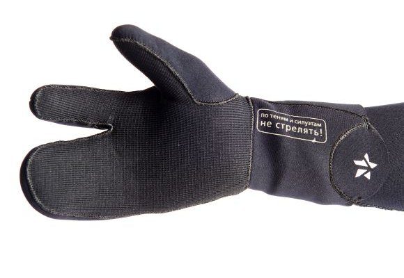 Рукавицы трехпалые с двойной обтюрацией. Оригинальный анатомический крой по форме расслабленной кисти руки позволяет избежать излишних усилий при удержании рукоятки ружья и существенно увеличивает длительность и комфорт пребывания в холодной воде.