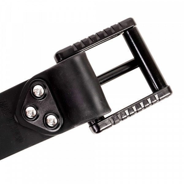 Ремень резиновый с чёрной пряжкой Марсельского типа имеет общий вес 290 гр, сделан из эластичной ленты толщиной 4мм и шириной 45мм (для того чтобы на него без проблем помещались свинцовые грузы иностранного производства, то есть его можно применять на выезде за границу), с 17 регулировочными отверстиями диаметром 10мм и расстоянием между ними 40мм (шаг регулировки).