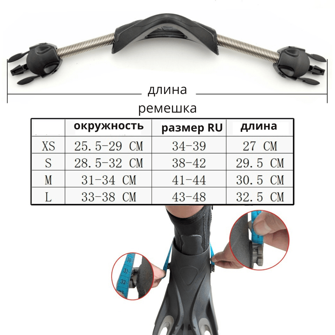 Ремешки пружинные для ласт с открытой пяткой. В комплекте 2шт. Пряжки с креплением на грибок в комплекте. Размеры: XS — 27 см S — 29,5 см M — 30,5 см L — 32,5 см