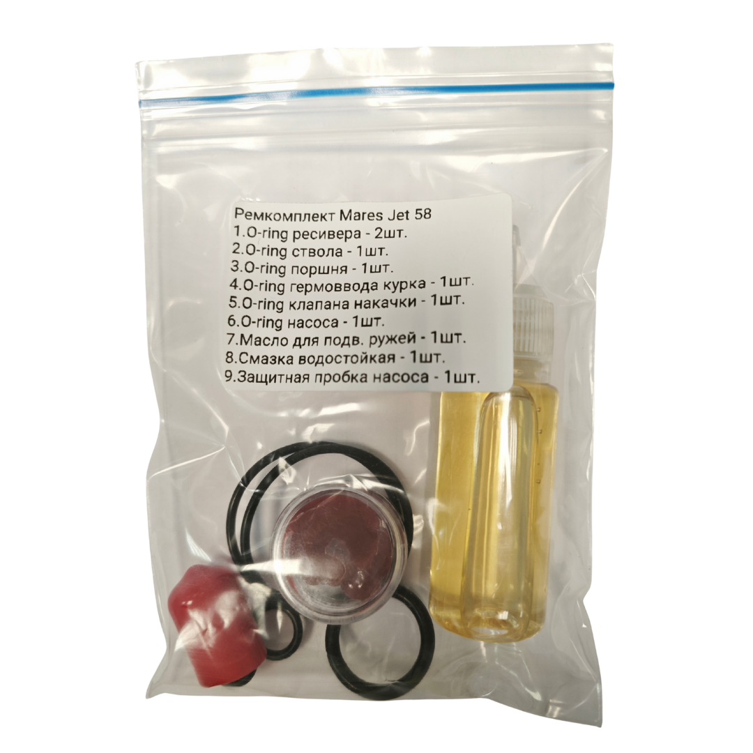 Ремкомплект для обслуживания подводного пневматического ружья Mares Jet 58Состав комплекта:Оринг ресивера -2шт.Оринг ствола — 1шт.Оринг поршня — 1шт.Оринг гермоввода курка — 1шт.Оринг клапана накачки — 1шт.Оринг насоса — 1шт.Масло для ружья 20 мл — 1шт.Смазка водостойкая — 1шт.Защитная пробка насоса — 1шт.