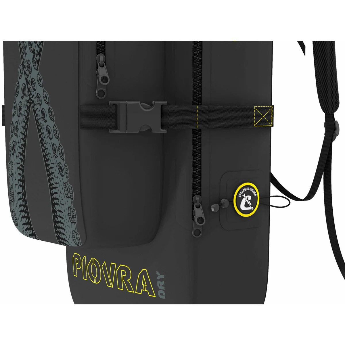 Сумка-рюкзак Piovra идеально подходит для снаряжения для спортивной рыбалки и фридайвинга. Она изготовлена из СУХОГО водоотталкивающего материала, хотя и не является водонепроницаемой. Основное отделение с воздухопроницаемой, влагоотталкивающей сеткой в нижней части предназначено для хранения рыболовных принадлежностей для фридайвинга, таких как гидрокостюм, длинные ласты (до 100 см), маска, трубка, пояс, нож и различные аксессуары. Дополнительное отделение, то есть внешний карман, похоже на сумку-холодильник для хранения холодных напитков или рыбы. Внешний эластичный плетеный шнурок позволяет разместить в нем другие предметы, например полотенце. С двух сторон имеются системы крепления для двух рыболовных ружей. В верхней части сумки имеется D-образное кольцо. Два плечевых ремня для переноски регулируются, а боковая ручка облегчает захват. Светоотражающий принт спереди обеспечивает большую видимость. Основное отделение оснащено проушинами для навесного замка.