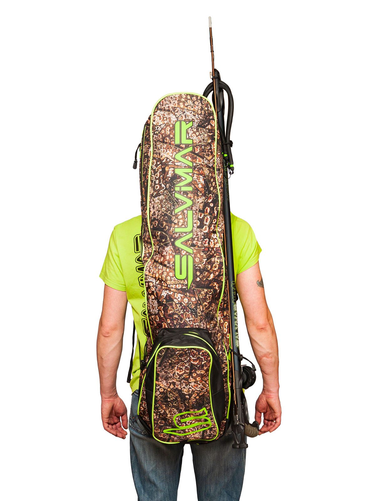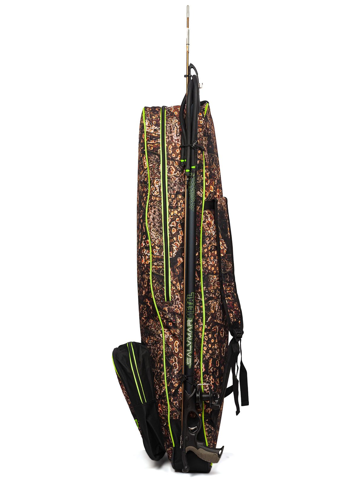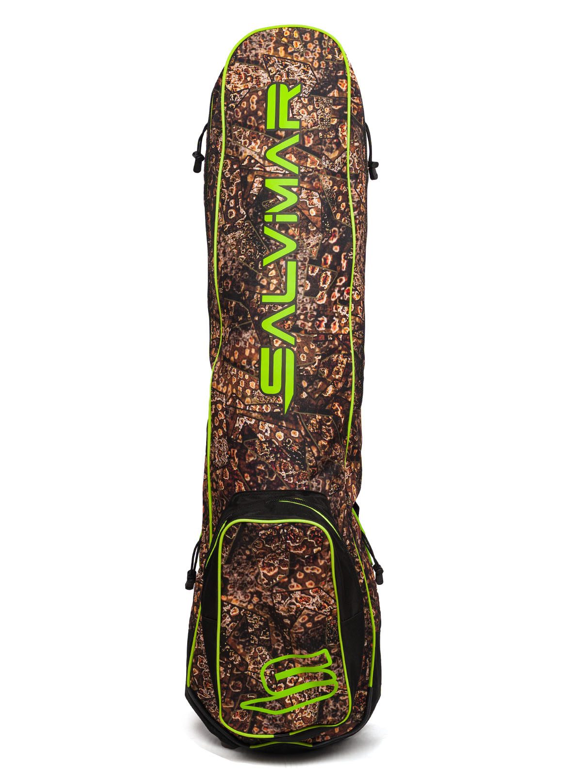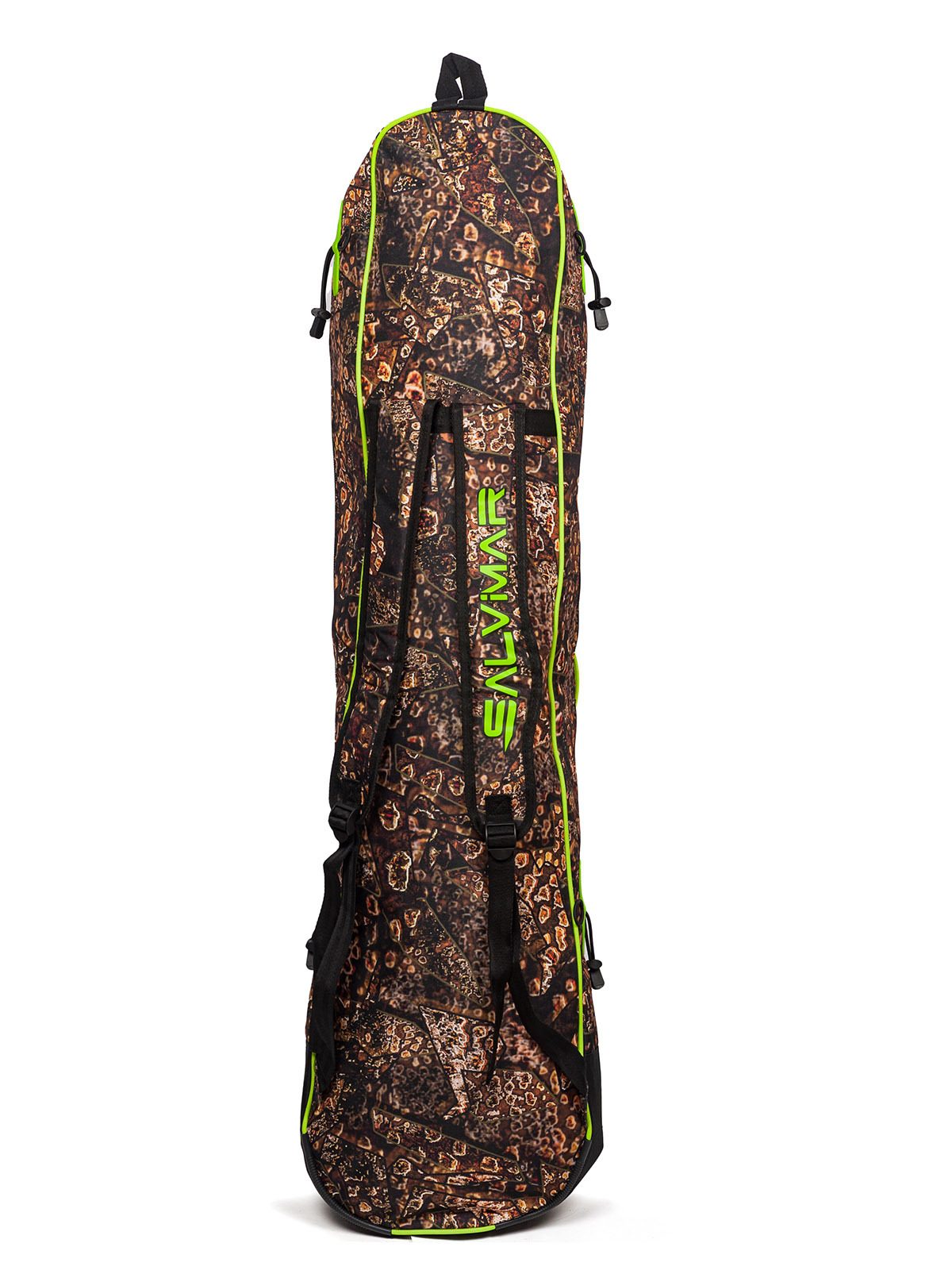 Сумка-рюкзак для комплекта снаряжения Salvimar Krypsis – очень удобна для тех подводных охотников, которые охотятся в местах, где нет возможности близко подъехать к Воде на машине. Ну, и для тех, кто ездит на подводную охоту на мотоцикле, тоже отличная вещь.Сумка вмещает в себя полноценные охотничьи ласты длиной до 110 см. И весь остальной комплект снаряжения с гидрокостюмом толщиной не более 5-и мм. Более толстые костюмы уже скорее не помстятся в нее.Также сумка-рюкзак Salvimar Krypsis оснащена креплением для подводного ружья сбоку. Вы можете прикрепить туда любое ружье длиной от 65. Более короткие ружье можно просто положить внутрь.Есть удобный карман для аксессуаров. Туда спокойно поместится маска с трубкой, фонарь кукан и еще куча других мелких аксессуаров .Лямки рюкзака сделаны из прочной ткани с мягкой подкладкой, которая защитит Ваши плечи от натирания и сделает достаточно комфортным ношение рюкзака даже с большим весом.Еще сумка-рюкзак Salvimar Krypsis оснащена двумя пластиковыми усилителями на дне. Они увеличивают срок службы и делают дно сумки существенно прочнее.Изготовлена из прочного водонепроницаемого нейлона. Можно не переживать за мокрое снаряжение после ныряния.Ну, и конечно сумка выполнена в фирменном стиле Salvimar Krypsis. А этот камуфляж уже стал визитной карточкой бренда Salvimar да и подводной охоты в целом.Габаритный размер: 115х30х20 см.Вес: 1,4 кг.