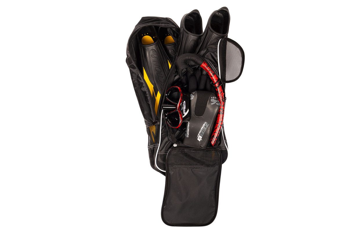— рекомендации по применению: фридайвинг, подводная охота, дайвинг, снорклинг, бассейн; — назначение: транспортировка ласт и снаряжения; — материал: нейлон; — объём, л: 20; — габариты сумки Д*Ш*В, см: 65*28*26; — габариты кармана Д*Ш*В, см: 30*22*7; — max нагрузка, кг: 10; — дополнительный наружный карман: да; — плечевой ремень: да, регулируемый по длине; — люверс: нет; — цвет: черный;