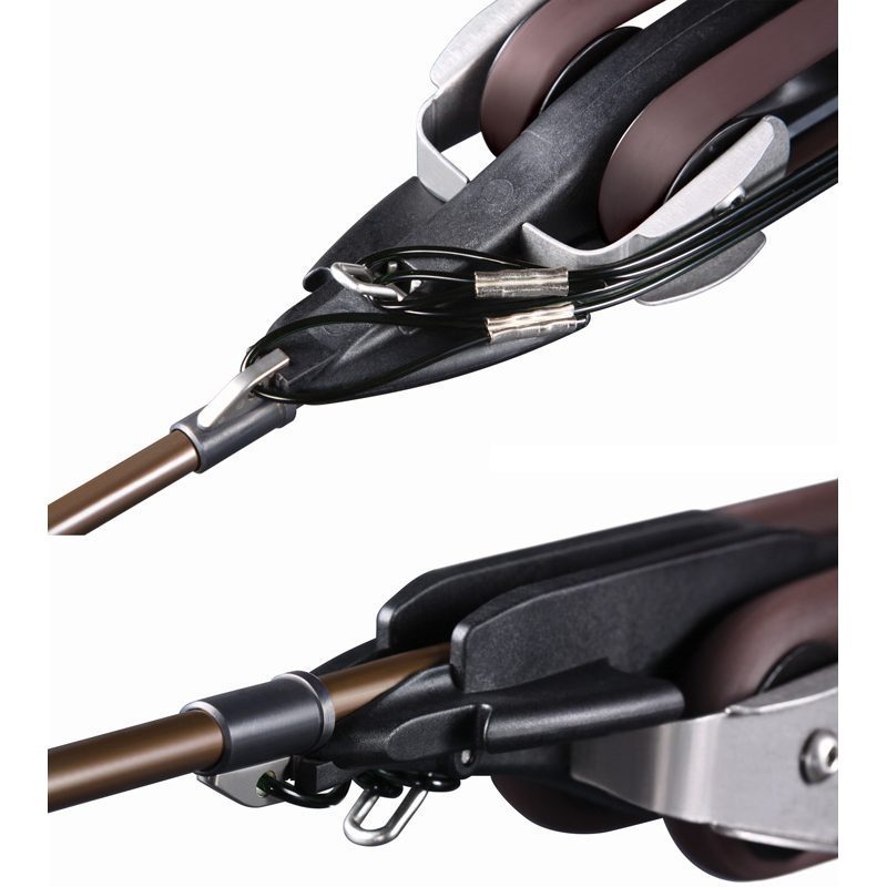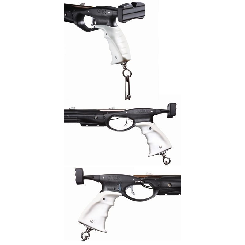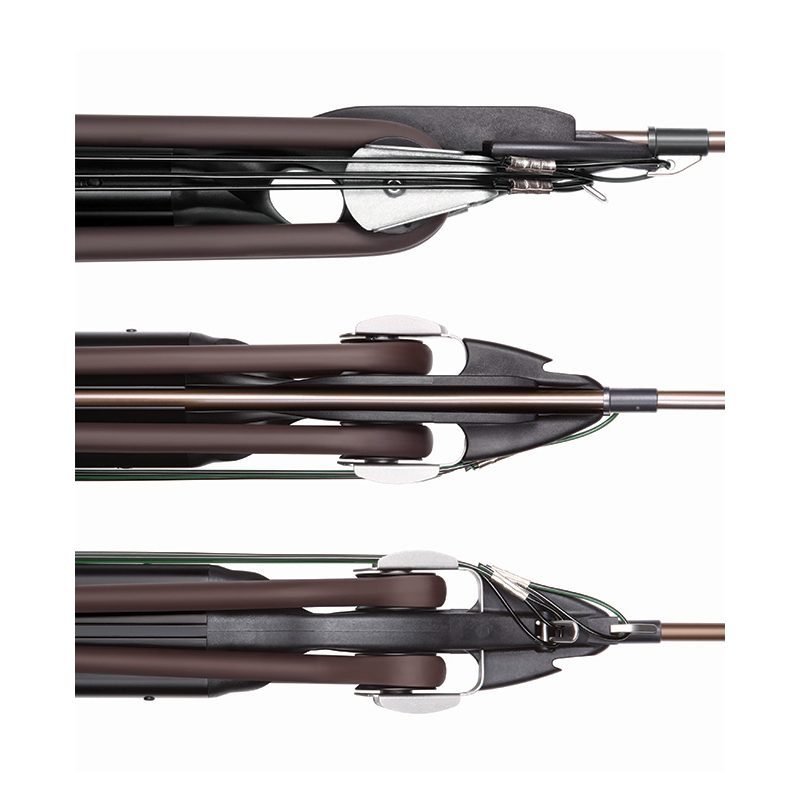 Ружье Cayman ET Roller обладает рядом уникальных особенностей и инноваций, выделяющих его из ряда остальных роликовых ружей. Ствол ружья выполнен из алюминия в форме «cuttlefish bone» и снабжен двумя направляющими «Enclosed Track», расположенными на верхней и нижней частях ствола соответственно. Верхняя направляющая предназначена для стабилизации гарпуна во время разгона (можно использовать гарпуны Shark Fin диаметром от 6,5 до 7 мм). Нижняя направляющая имеет три фиксированных зацепа для закрепления тяг с обратной стороны. Это позволяет легко и быстро изменять мощность ружья в зависимости от поставленной задачи, расширяя тем самым возможности вашего ружья. Надульник имеет два шкива со стеклянными сферами, имеющими особое покрытие, защищающее от песка. Стеклянные сферы увеличивают производительность ружья и осевую стабильность тяг. Отверстие в головной части позволяет использовать одну или две кольцевых тяги (в последнем случае диаметр каждой тяги не должен превышать 16 мм. Головная часть также снабжена двумя фронтальными стабилизаторами для нейтрализации небольшой отдачи, которую создает ролик. По бокам шкивов расположены две направляющие для линя, предотвращающие контакт линя с тягами. Рукоятка оснащена стандартным механизмом Cayman, выполненным из нержавеющей стали, что обеспечивает великолепную чувствительность даже при больших нагрузках. В нижней части рукоятки имеется металлическое кольцо с карабином (входит в комплект), а в боковой – кольцо для эластичного поводка), кроме того, в комплекте имеется дополнительная эргономичная рукоять и накладка на упор. Ружья комплектуются гарпунами 6.75 мм с тремя зацепами Shark Fin, закрепленными при помощи лазерной сварки, и предназначенными специально для использования с веревочными зацепами Dyneema. Каждый гарпун снабжен особым инновационным стабилизатором, имеющим двойную функцию: стабилизировать гарпун во время полета и служить точкой крепления линя. Ружье выпускается в длинах 75, 85, 95, 105 и 115 см.