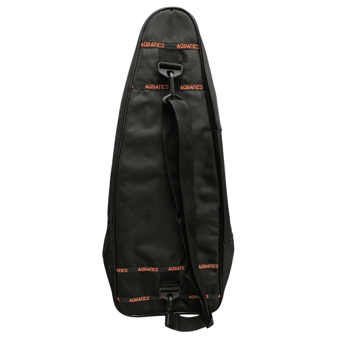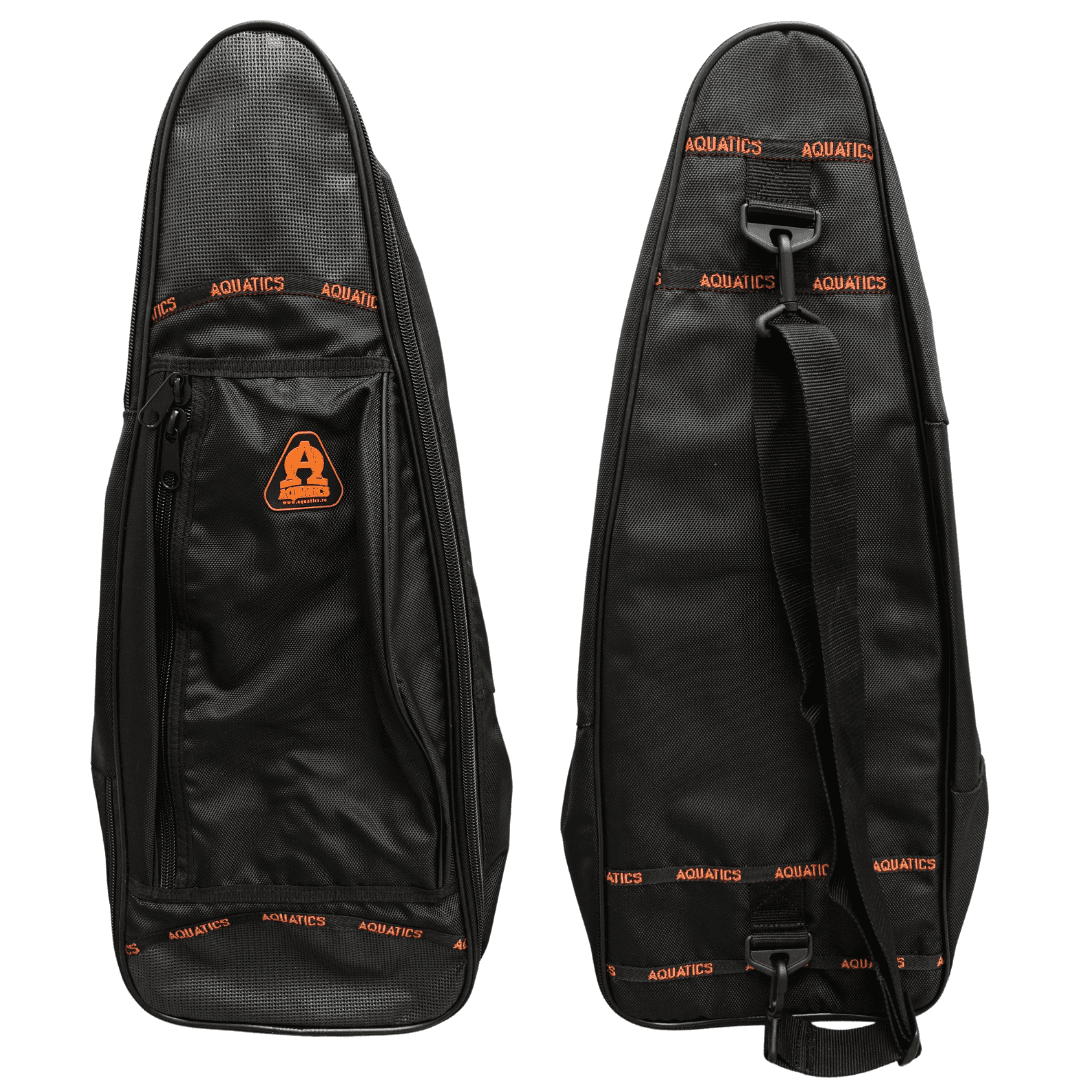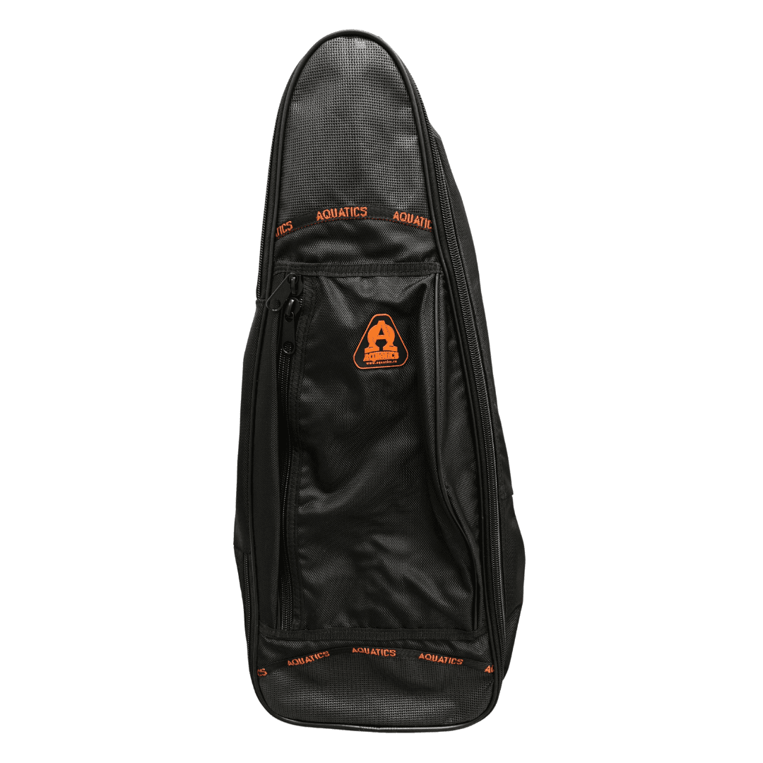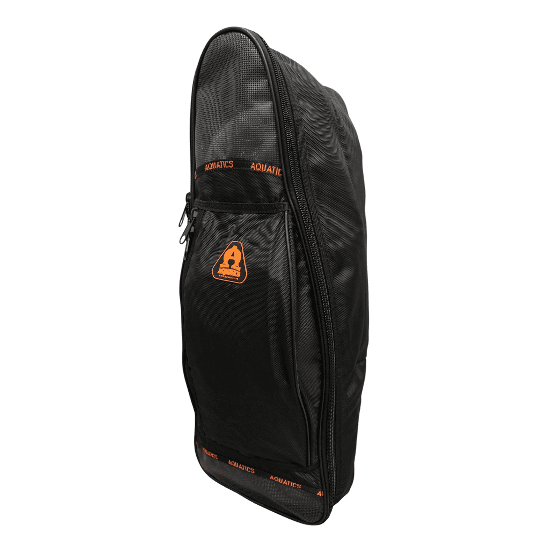 Сумка Акватикс для транспортировки комплекта для плавания — маска+трубка+ласты. В основное отделение сумки свободно помещается пара ласт (общей длиной до 62 см), комплект маски и трубки, тонкий гидрокостюм или купальник и небольшое полотенце. Сумка сделана расширяющейся к верху, что бы в неё смогли легко уместиться ласты большого размера с широкой калошей. Снаружи сумки имеется накладной карман для небольших аксессуаров или ключей и документов. Сетчатые вставки позволяют активно вентилироваться содержимому сумки. Сумка имеет усиленные молнии с двумя бегунками на центральном отделении. На спинке регулируемый по длине ремень. Размеры: Длина сумки: 69 см Ширина днища 27 см Ширина в верхней части: 17 см Глубина днища: 8 см Глубина верхней части: 25 см Накладной карман: 22 х 36 см, глубина 5 см