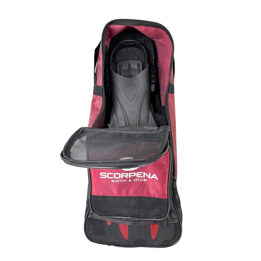 Основное предназначение сумки Scorpena Swim Light — транспортировать комплект для плавания на пляж и обратно.В основное отделение сумки свободно помещается пара ласт (общей длиной до 62 см.), комплект маски и трубки, тонкий гидрокостюм или купальник и небольшое полотенце. Сумка сделана расширяющейся к верху, что бы в неё смогли легко уместиться ласты большого размера с широкой калошей.Снаружи сумки имеется накладной карман для небольших аксессуаров или ключей и документов.Сетчатые вставки позволяют активно вентилироваться содержимому сумки. Сумка имеет усиленные молнии с двумя бегунками на центральном отделении.Сверху расположена ручка для переноски, а на спинке присутствует регулируемый по длине ремень.Размеры:Длина сумки: 62 см,Ширина днища 28 см,Ширина в верхней части: 17 см,Глубина днища: 8 см,Глубина верхней части: 18 см.Накладной карман: 20 х 22 см, глубина 5 см.
