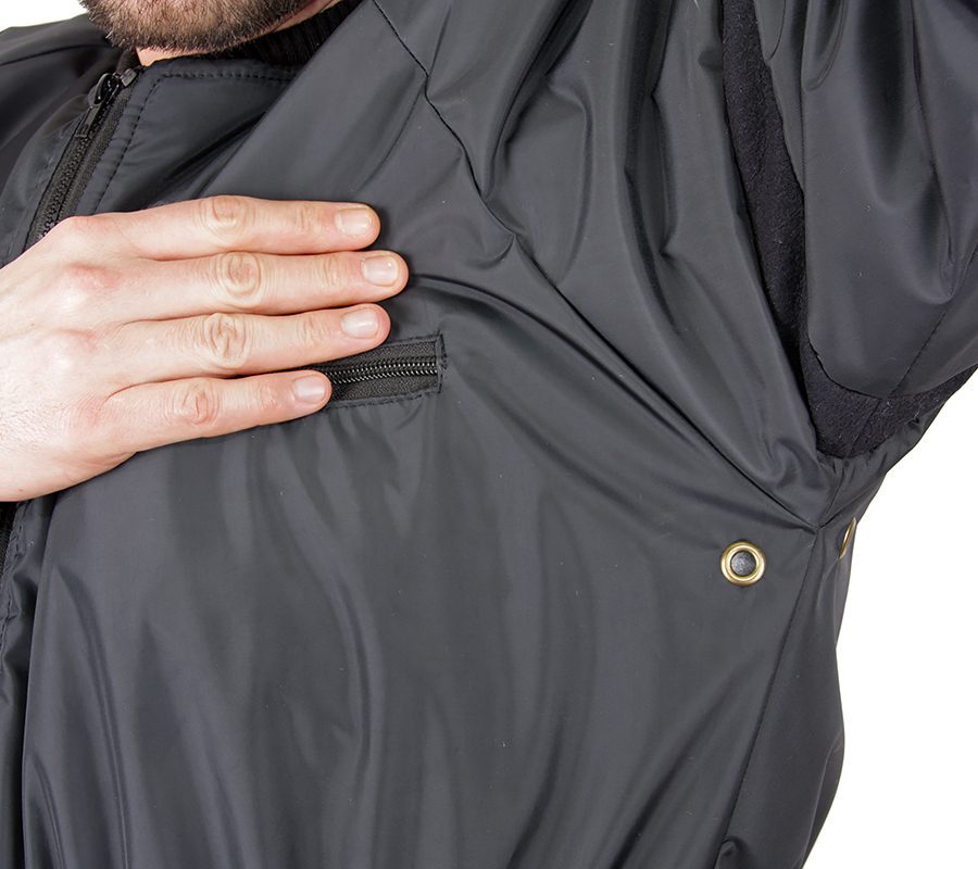 Моно-комбинезон предназначен для утепления сухих гидрокостюмов для дайвинга в условиях низких температур. Утеплитель оснащен передней двухзамковой молнией, теплозащитной планкой под молнией, двумя боковыми и одним нагрудным карманом. Манжеты утеплителя на запястьях и щиколотках из эластичной ткани с ограничителями движения в рукавах и брюках, предотвращающих «задирание» ткани при одевании гидрокостюма. Для улучшения вентиляции под мышками установлены люверсы. Для предотвращения потерь тепла на комбинезоне используются «теплые» швы, т.е. отсутствует сквозная прострочка изделия. Первый внутренний слой. Ткань флисовая, обладающая свойством испарения влаги, плотностью 180 гм², ПЭ 100%, трикотажное полотно с начесом, используется при изготовлении спортивных костюмов, а также элементов спортивной одежды для активного отдыха. Второй внутренний слой. Утеплитель Thinsulate® (Тинсулейт) производства фирмы 3М, плотностью 200 гм². Утеплитель Thinsulate® на сегодняшний день является признанным высококачественным утеплителем, применяемым при изготовлении утепленной профессиональной спортивной одежды и снаряжения. Его основные показатели – высокое тепловое сопротивление при малом объеме, отсутствие остаточной деформации после сжатия, отсутствие «миграции» волокон при использовании, высокая механическая прочность. По информации производителя теплопакет состоящий из: ткань верха – Оксфорд, утеплитель Тинсулейт 200 гм² один слой и подкладки рекомендован к использованию при температуре до -17°С на открытом воздухе. Внешний слой. В качестве внешнего слоя используется ткань Нейлон с мембранным покрытием. Данная ткань имеет высокую прочность к механическим повреждением, и имеет внешнюю «скользящую» поверхность, что удобно при одевании гидрокостюма. Утепленный комбинезон для дайвинга комплектуется сумкой-чехлом на молнии.