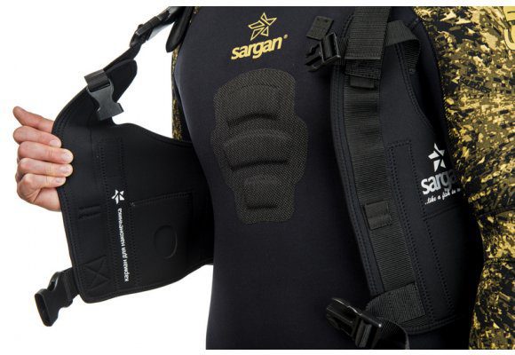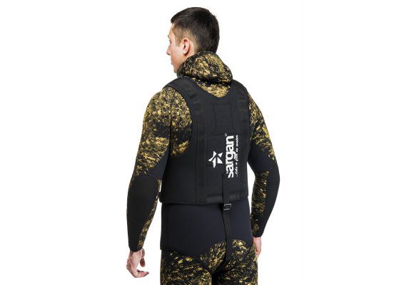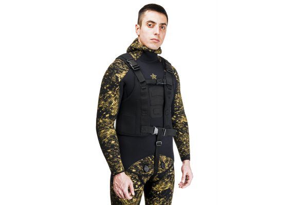 Разгрузочный жилет позволяет охотнику равномерно распределить груз по телу.Рекомендуется размещать до 40% груза в жилете, 60% на поясе.Жилет «Бронник» позволяет помещать в себя до 8 килограммовых грузов, представляющие собой слитки размером 100 мм × 70 мм и толщиной 10 мм (это в два раза тоньше обычного груза 1кг). Материал жилета – компрессионный неопрен толщиной 3 мм черного цвета покрытого нейлоном.Из-за большей плотности данный вид неопрена имеет значительно меньшую положительую плавучесть. А это значит, что меньше груза уйдет на компенсацию плавучести самого жилета.Жилет очень хорошо разгружает поясницу, сделан очень прочно, не вытягивается и не рвется. «Броник» обладает хорошей обтекаемостью и прилеганием, засчет расположенных на нем брасового ремня, 2-ух горизонтальных и 2-ух вертикальных пряжек-замков фастекс, быстро и легко расстегивающихся при первом же нажатии. В данном жилете удобно лазить в завалы и проплывать под «»крышами»». Также разработчики жилета «Броник» позаботились и о безопасности подводного охотника, расположив на правой лицевой стороне жилета две петли из стропы 25 мм для вертикального крепления любого ножа, предназначенного для подводной охоты.