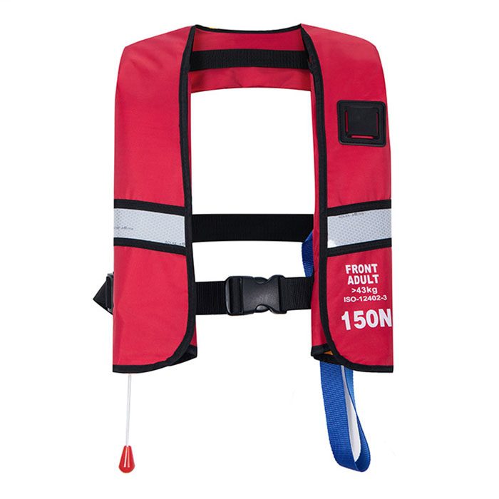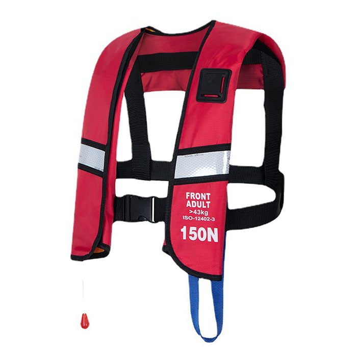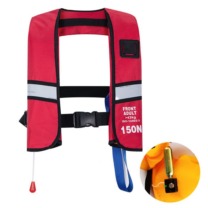 Автоматический спасательный надувной жилет.Подходит для людей весом от 43 кг.Плавучестью 150H и легко держит на плаву взрослого человека до 250 кг!Обхват груди до 170 см.Жилет не стесняет движений и автоматически наполняется воздухом при попадании в воду.Имеется возможность принудительного ручного активирования механизма наполнения.В комплекте с жилетом идет баллон СО2 35 гр. и водочувствительный датчик.
